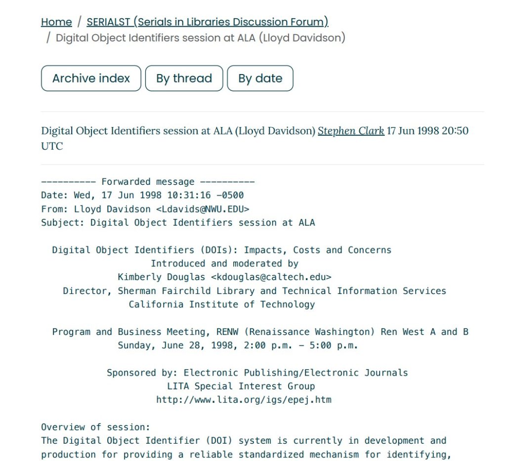 Critical Commentary: This 1998 email announcement details a panel session on Digital Object Identifiers (DOIs) organized by Lloyd Davidson for the American Library Association (ALA) annual meeting. Titled “Digital Object Identifiers: Impacts, Costs and Concerns,” the session brought together early stakeholders in the DOI system, including representatives from Sun Microsystems, the International DOI Foundation, R.R. Bowker, and several U.S. academic libraries, to discuss the technical architecture, governance, and commercial potential of the DOI. The announcement also includes a curated bibliography of foundational articles and publisher case studies on DOI development and implementation.