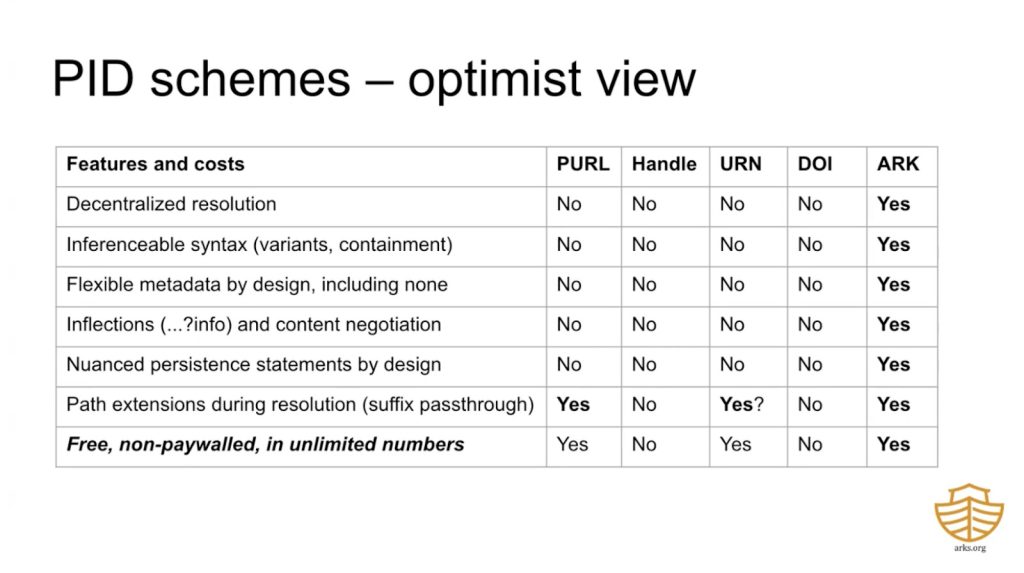 Critical Commentary: This video, created by John Kunze, provides an introduction to Archival Resource Keys (ARKs) and the broader landscape of persistent identifier (PID) schemes. Kunze, a key figure in the development of ARKs, outlines their technical design, governance philosophy, and practical advantages over more commercialized systems like the DOI. The presentation emphasizes ARKs’ commitment to decentralization, institutional autonomy, and affordability, positioning them as a non-proprietary alternative for managing digital resources.
