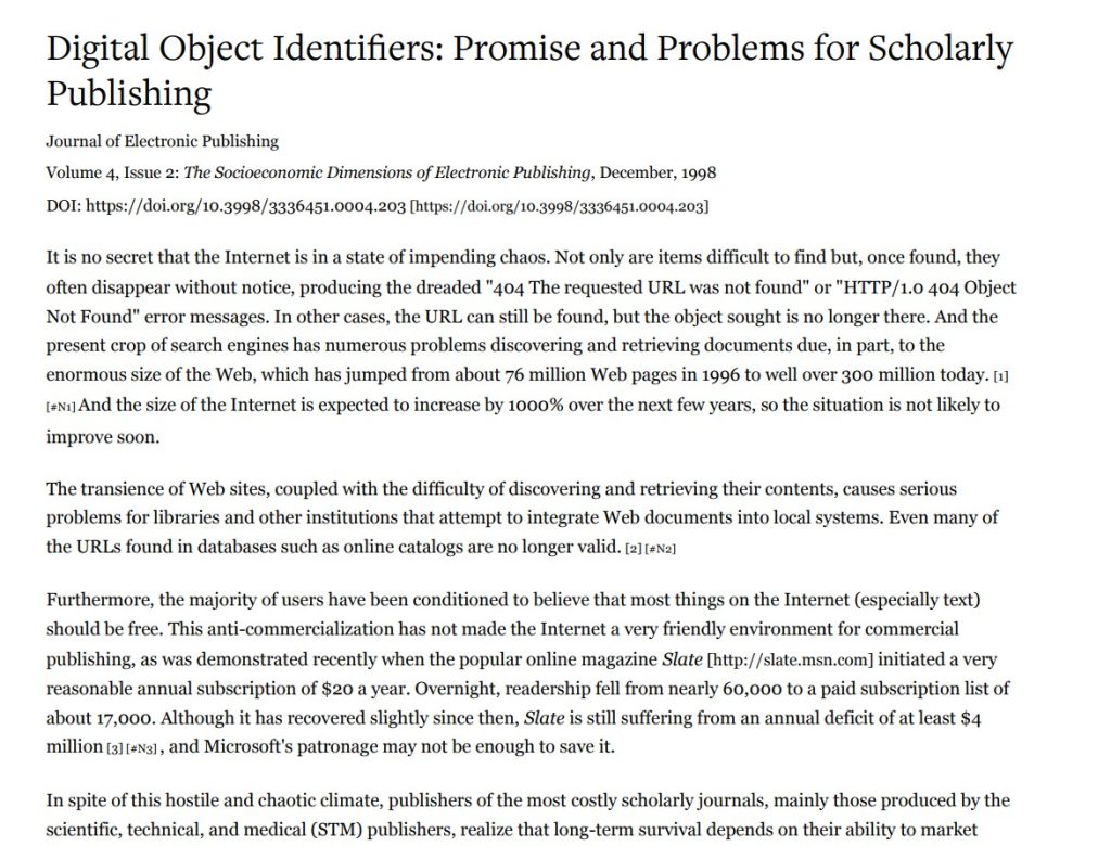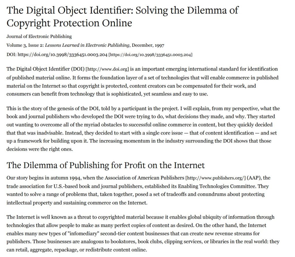 Critical Commentary: This 1998 article “Digital Object Identifiers: Promise and Problems for Scholarly Publishing,” offers a detailed account of the early development and institutionalization of the DOI system. Drawing from events in the mid-1990s, the authors provide historical insights into the founding of the International DOI Foundation (IDF), including its original mission statement: “to ensure that the system meets the needs of publishers.” This explicit prioritization of commercial publisher interests was later quietly removed from the IDF website, signaling both the original orientation of the DOI toward protecting publishing industry profitability and the subsequent effort to obscure these origins.