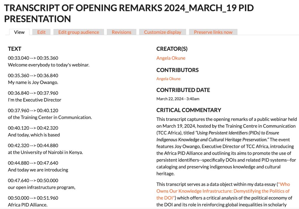 Critical Commentary: This transcript captures the opening remarks of a public webinar held on March 19, 2024, hosted by the Training Centre in Communication (TCC Africa), titled “Using Persistent Identifiers (PIDs) to Ensure Indigenous Knowledge and Cultural Heritage Preservation.” The event features Joy Owango, Executive Director of TCC Africa, introducing the Africa PID Alliance and outlining its aims to promote the use of persistent identifiers, specifically DOIs and related PID systems, for cataloging and preserving indigenous knowledge and cultural heritage.
